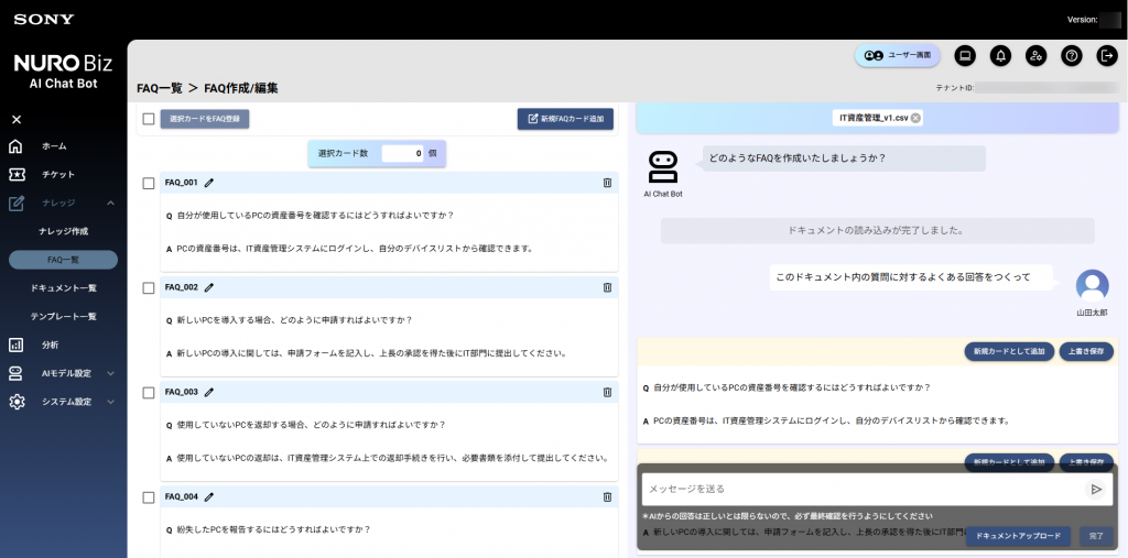 社内マニュアル等のドキュメントをアップロードするとAIが自動で学習。ドキュメントがない場合も、情システンプレートやAIとの対話形式、URL共有でFAQ作成が可能です。また、エスカレーションの内容をAIが分析し、新たなナレッジとして自動でFAQを提案。それらを登録することで、次回同様の質問があった際にはAIが回答します。