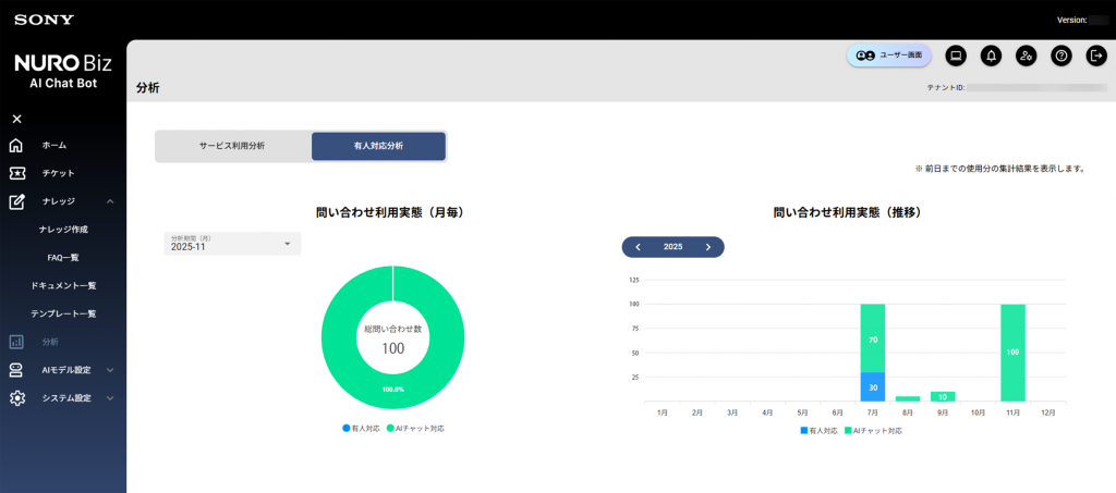 分析レポートもあり、月間の利用者・未利用者比率やAI・有人対応の比率等、利用状況が確認可能