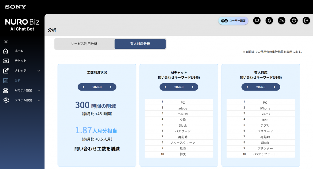 月に何時間・何人分の問い合わせ対応工数を削減できたかをグループごとに算出し、可視化する分析機能を追加いたしました。